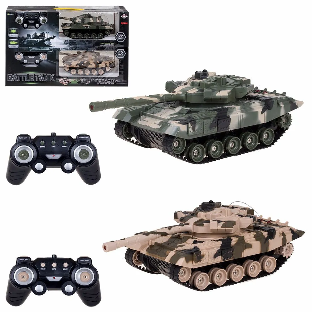 Танковый бой Набор танков на радиоуправлении Play Smart Танковый бой. Отличный подарок ребенку, увлекающемуся военной техникой. Набор включает в себя 2 радиоуправляемых танка, между которыми можно устроить бой! В боевом режиме из дула выстреливает инфракрасный лазер, сопровождается звуком взрыва и вибрацией при попадании в танк противника. Танки оснащены светодиодами, загорающимися во время вращения башни. Игрушки выполнены с вниманием к деталям. У танка высокая скорость движения. Стволы танков опускаются, и поднимаются на 35°,башни поворачиваются на 360°. При помощи пульта управления танки двигаются вперед, назад, поворачивают влево и вправо. Звуковые эффекты во время сражения раздаются реалистичными звуками выстрелов, звук движущейся машины и шумом поворота пушки. На башне каждого танка есть световой индикатор жизней, вы можете устроить танковое сражение, при помощи инфракрасного наведения целясь в башню вражеской машины. Все батарейки и зарядки в комплекте.